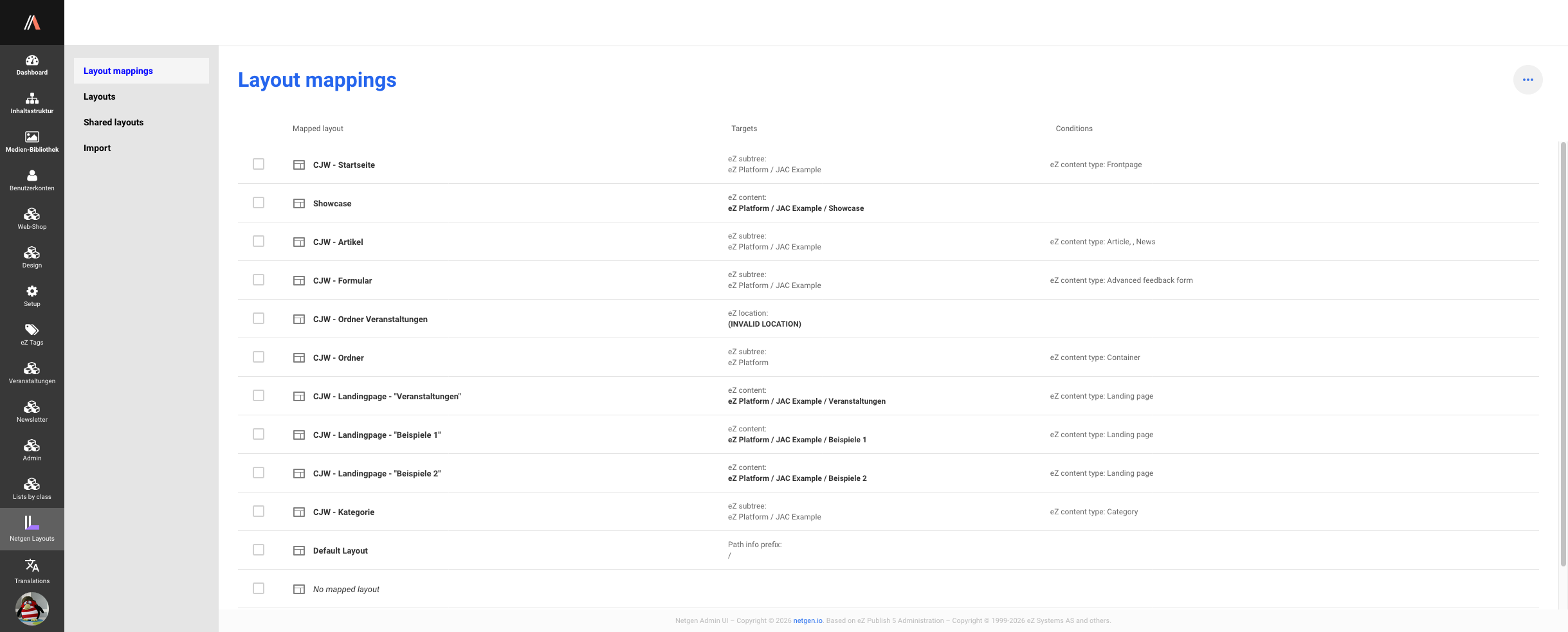 Exponential Platform Nexus 1.0.0.0.3 Admin Mappings - Netgen Layouts Dashboard Screenshot